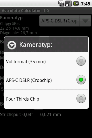 Una pequeña aplicación para los fotógrafos astronómicos para el cálculo de la imagen presentada tamaños para ciertas combinaciones de cámara y lente. También puede calcular el tiempo de exposición máxima para las tomas sin guía y calcular la longitud de la estrella se arrastra.