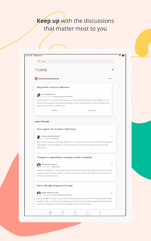 No molestarás a la gente: un hilo separa el hecho de tener acceso a la información y ser notificado al respecto. Si comenta en un hilo, solo notificará a aquellos que también se unieron a la discusión. Mientras todos en el espacio pueden ver el hilo, nos aseguramos de no notificarlo en exceso.