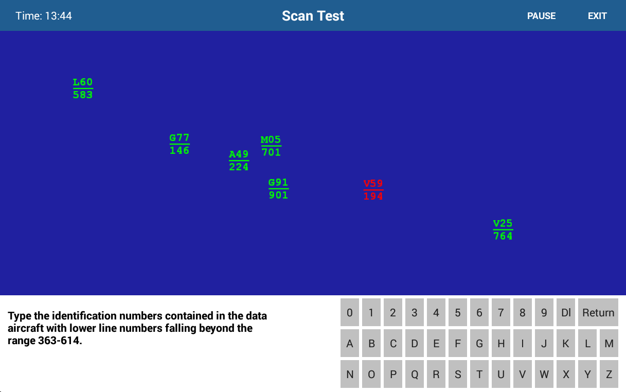 • Prueba de exploración: Los participantes tienen que controlar la acción en la pantalla y responder a los aviones que viajan a una velocidad más allá de un determinado rango de tolerancia