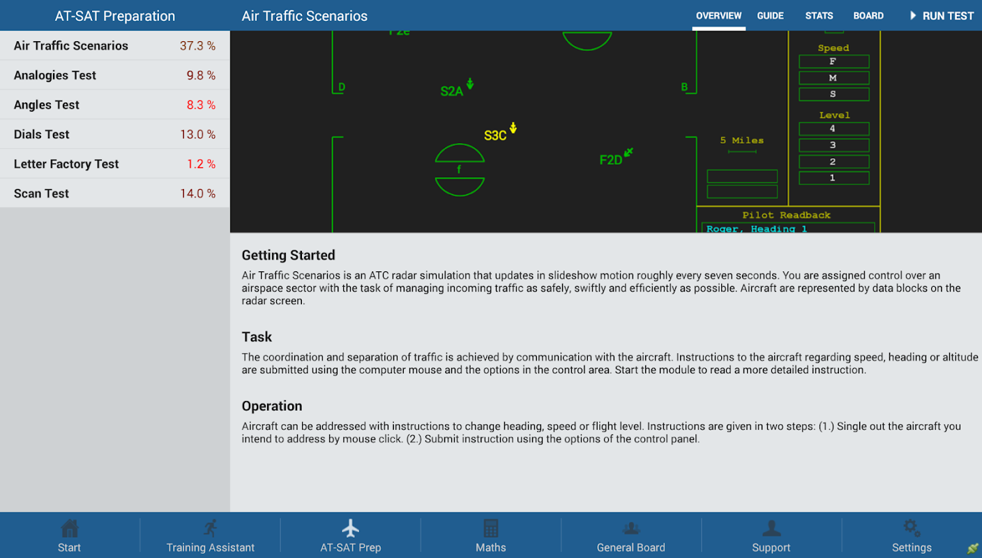 • Escenarios de Tráfico Aéreo de prueba: Se trata de una simulación de radar ATC que se actualiza en la presentación de movimiento más o menos cada siete segundos. Los participantes se les asigna el control sobre un sector del espacio aéreo con la tarea de gestionar el tráfico de entrada como de forma segura, rápida y eficientemente como sea posible.
