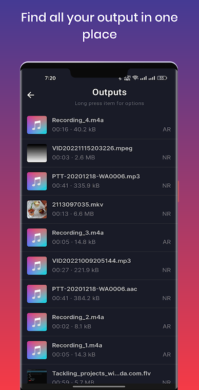 Solo tiene que importar archivos de audio o video de su biblioteca de medios y con un toque puede eliminar el ruido de su archivo de audio y video. Puedes guardarlo en varios formatos. Y también puedes compartirlo fácilmente en aplicaciones sociales.