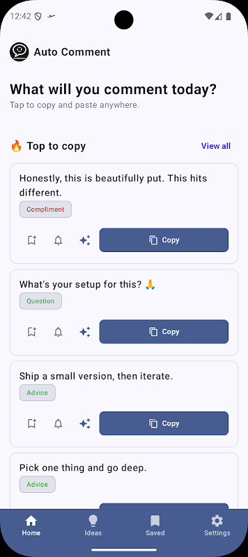 Auto Comment te ayuda a crear, copiar y pegar comentarios auténticos y listos para publicar en Instagram, TikTok, X y más — sin perder tiempo. Perfecto para creadores de contenido, marcas y comunidades.