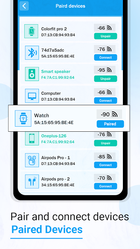 ★ Bluetooth Strength : It will scanning nearby Bluetooth devices and display the strength with their name, distance, address and RSSI instantly after scanning