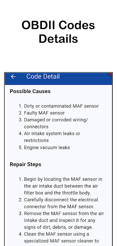 - Detalles completos del código: incluye descripciones, causas probables, pasos de reparación y estimaciones de costos.