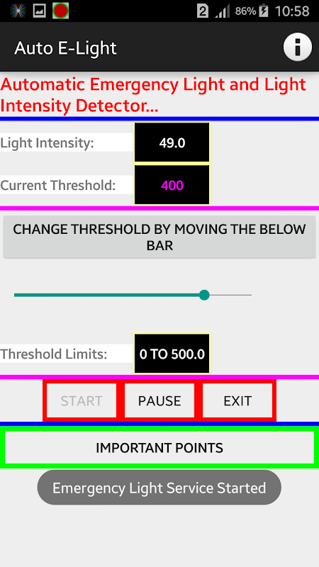 The simple and light automatic emergency light application enables android handset owners use their device's flashlight as emergency light that turned on/off automatically based on intensity of surrounding light detected by light sensor of the device and configured threshold setting.