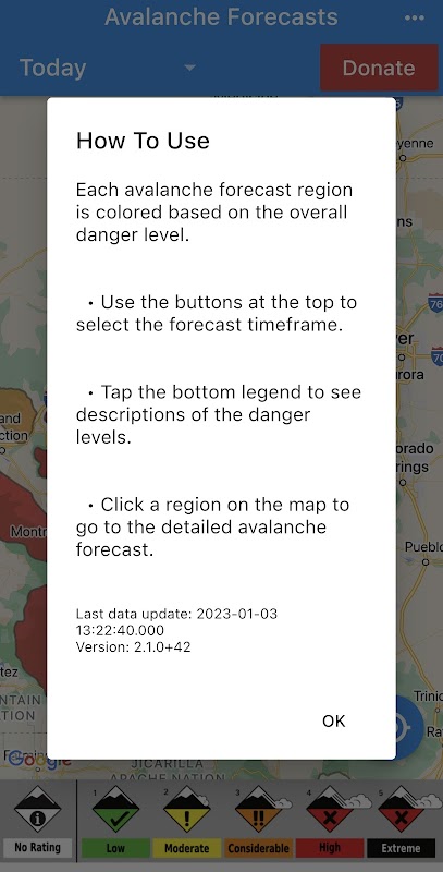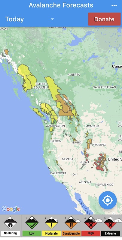 Esta aplicación facilita ver los niveles de peligro actuales para cada centro de pronóstico en América del Norte. Muestra el peligro presente coloreando las regiones pronosticadas en un mapa y permite a las personas seleccionar un marco de tiempo futuro para los centros que lo respaldan (Hoy/Mañana/2 Días Fuera). Haga clic en cualquier región para ver el pronóstico detallado de avalanchas del centro de pronóstico de origen.
