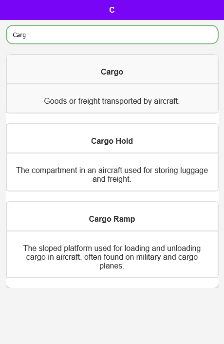Interfaz fácil de usar: la aplicación del diccionario de aviación está diseñada pensando en el usuario. Navegue sin esfuerzo a través de nuestras categorías organizadas A-Z y disfrute de un diseño limpio y sencillo que hace que aprender sobre aviación sea simple y divertido.