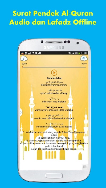 - Carta Carta corta Corán = audio, lafadz y la traducción de las letras cortas Corán que se leen durante las oraciones.
