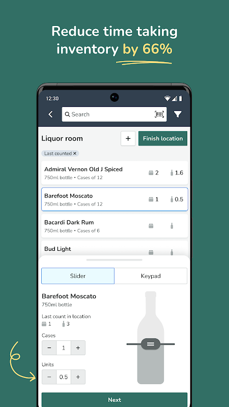• Obtenga recuentos precisos de botellas abiertas con nuestro control deslizante de botellas