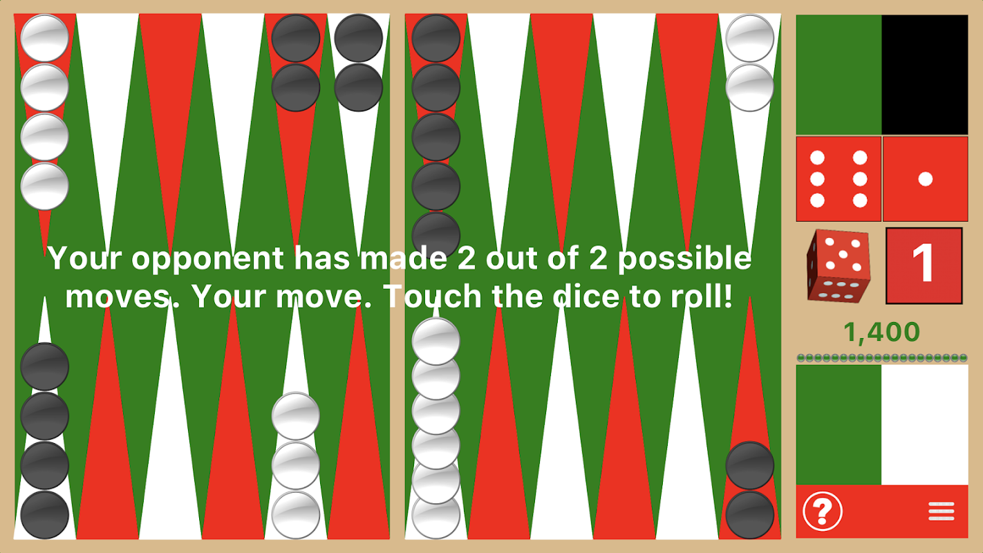 Las piezas de backgammon se conocen generalmente como damas o pepitas. El objetivo es eliminar (quitar) todas tus fichas del tablero antes de que tu oponente pueda hacer lo mismo. Al comienzo de cada juego, las fichas se colocan en posiciones predeterminadas. A medida que avanza el juego, el oponente puede bloquearlos o golpearlos. Para comenzar un nuevo juego, toca el botón de nuevo juego. Cada vez que juegas un nuevo juego, se deducen 100 puntos de tu puntuación.