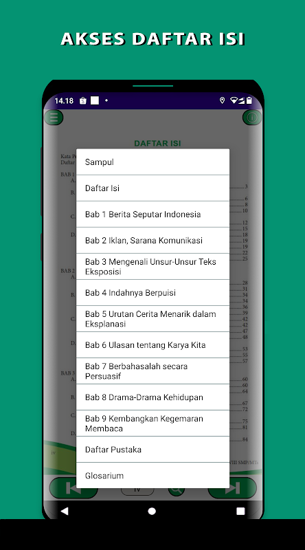 Libro escolar electrónico de Indonesia (BSE) para el plan de estudios SMP / MT Clase VIII 2013. Esta aplicación se creó para facilitar que los estudiantes aprendan indonesio en cualquier lugar y en cualquier momento.