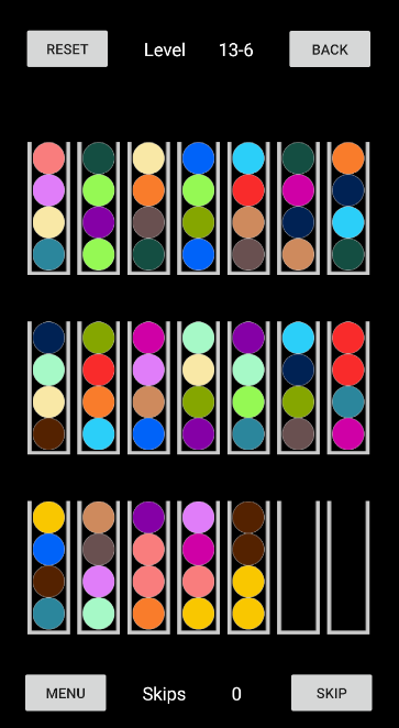 Popular puzzle de clasificación de bolas. Sin anuncios. Si otros puzzles de clasificación de bolas son fáciles para ti, intenta resolver este puzzle. Contiene niveles más grandes con mayor dificultad y un botón de retroceso y salto gratis. Pero si tu dificultad actual es demasiado difícil para ti, simplemente puedes cambiar a una dificultad más fácil.
