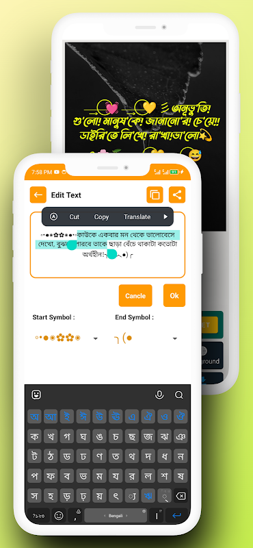 Si desea crear una hermosa imagen de estado con cualquier imagen favorita. Nuestra aplicación lo hace simple. Simplemente seleccione una imagen de la galería de su teléfono, personalícela y descargue el resultado. Además, explore nuestra colección de elegantes subtítulos de estado en bengalí.
