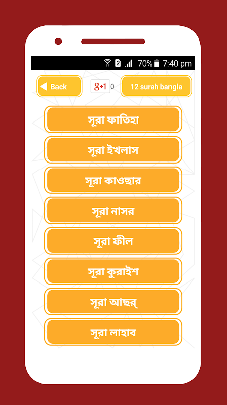 Surah es una aplicación bengalí islámica Elegimos 12 de 114 sura bangla anubad. Como el nombre sugiere es lo más importante después de iman, proporcionamos 12 suras de al quran bangla uccharon con significado. No pudimos gestionar todos los archivos de audio sura o quran en lugar de onubad. Obtendrás la aplicación islámica, namaz shikkha all sura bangla