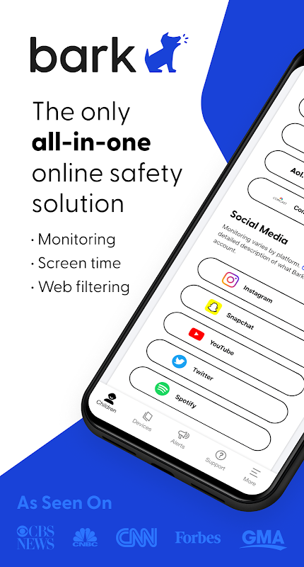 Bark monitorea los mensajes de texto, el correo electrónico, YouTube y más de 30 aplicaciones y plataformas de redes sociales de su hijo para detectar problemas como el acoso cibernético, las ideas suicidas, el contenido para adultos, los depredadores sexuales, las blasfemias, las amenazas de violencia y más. Los padres reciben alertas solo cuando ocurre algo potencialmente problemático en línea. No tendrá acceso completo a todo en el teléfono de su hijo, solo a lo que podría necesitar saber.