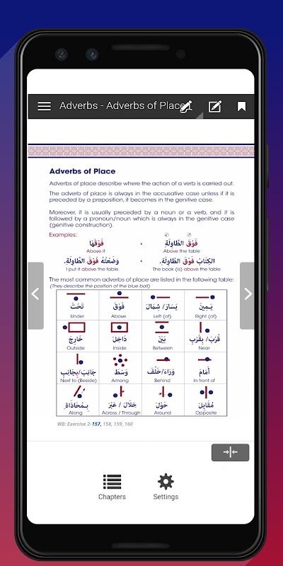 Esta aplicación es un libro electrónico interactivo que incluye las reglas gramaticales básicas, como sustantivos, pronombres, adjetivos, verbos, adverbios, preposiciones, etc., y cómo las usamos para construir oraciones. Además de centrarse en los casos gramaticales de las palabras en la oración que ayudan al alumno a evitar errores gramaticales para que su idioma árabe sea preciso y fuerte.