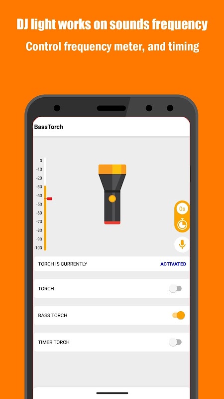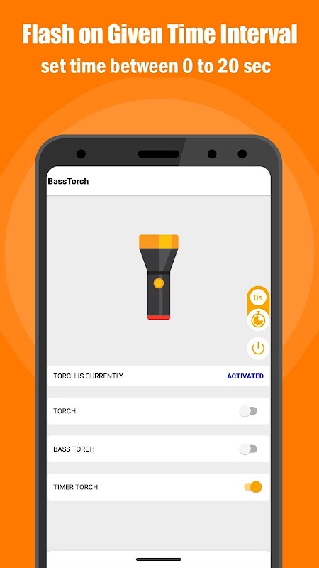 You can use this app to normally turned on and off your flash light or else you can use basstorch function to control your flashlight accordingly to your voice or mobile sound frequency as well as you can set frequency meter as you want and you can set timer option if you want torch should blink it is turned on, timertorch is also a good feature to control your flashlight in the given time interval.