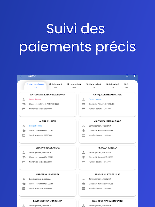• 🖨️ Imprima los pagos con una impresora térmica o una impresora tradicional (según la capacidad de su dispositivo). • 📊 Resumen del colegio con estadísticas en tiempo real en el panel de control (cantidades cobradas, cantidades adeudadas, número de estudiantes al día, etc.).