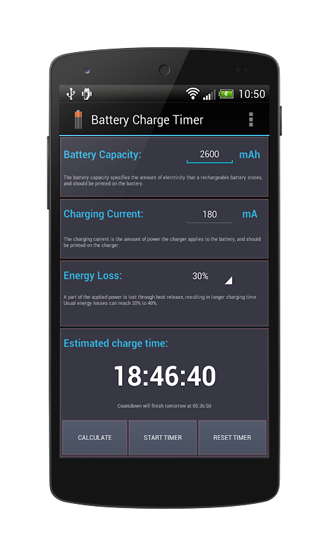 Batería de temporizador de carga le permite evaluar el tiempo necesario para cargar las baterías recargables, dependiendo de la capacidad de la batería, la corriente de carga y la pérdida de energía. Si desea que se le avise cuando llega el momento de desconectar el cargador, se puede establecer un temporizador para que le notifique. Si quieres sacar el máximo provecho de sus baterías recargables, esta aplicación es para ti!