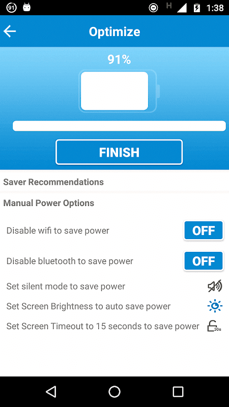 Battery saver app help you to switch off all the extra functions like WiFi, Bluetooth, GPS, FLight Mode, Brightness and other energy consuming apps on the device. App Will Notify when power get down in percentage and even when you plug your device in charging it shows charging stages.