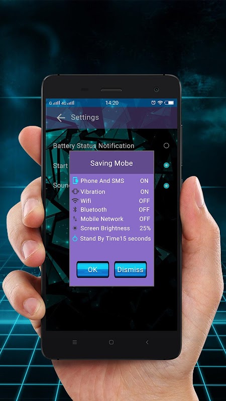 When the phone is low, the user simply click the power button to turn on the power saving mode, start the power saving mode after the following content is turned off: Turn off WIFI, Bluetooth, GPS positioning, background lights, mobile phone mute, vibration mode off shut down. The "Settings" button allows you to customize the content to be closed.