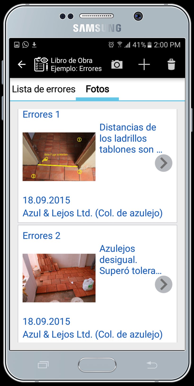 Fotos: las fotos se agregan desde la biblioteca del dispositivo o se toman directamente del informe y se les marca con la fecha de los datos "Exif" de la foto. Se pueden editar (escribir y dibujar en fotos) después de la sincronización y subirse a la web como un álbum de fotos HTML.