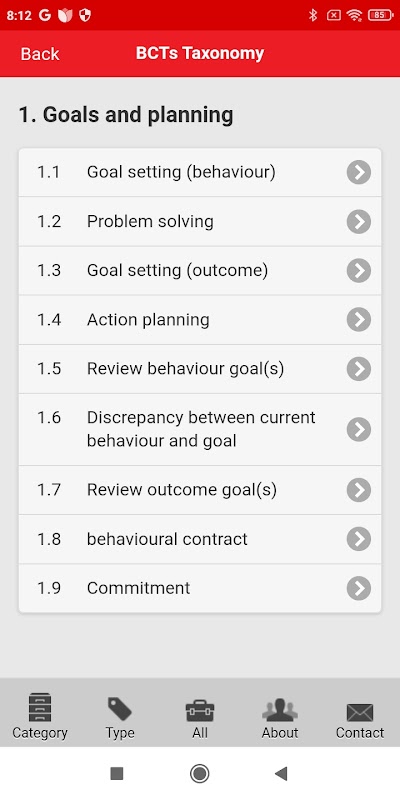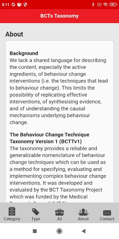 Esta aplicación es una versión fácil de navegar y con capacidad de búsqueda completa de la Taxonomy Technique Taxonomy v1 (BCTTv1) publicada por Michie et al. (2013).