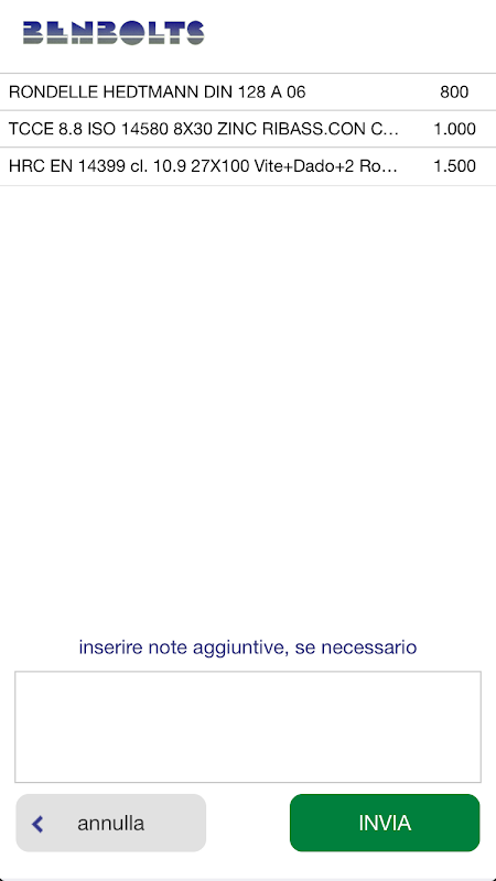 Un práctico servicio de todos: Benbolts es capaz de proporcionar disponibilidad en tiempo real de todos los elementos. No sólo! Con simples clics puede hacer pedidos directamente desde su teléfono inteligente, la aplicación Benbolts que ofrece todo esto en el almacén de envasado.