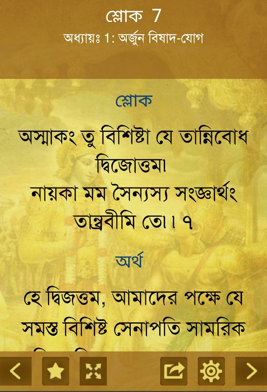 Puede compartir el verso del Bhagavad Gita Bangla con sus amigos usando cualquiera de sus aplicaciones favoritas como whatsapp, Facebook, Google+, etc; Simplemente vaya a la página del versículo y toque el ícono de enviar (ver captura de pantalla) en el panel inferior para elegir las aplicaciones para compartir