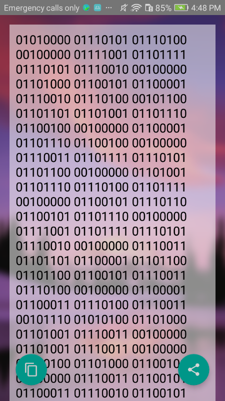 Binary to text converter is the best way to encode your confidential messages and share it with others so that they can decode it later with this binary translator app. It has copy button to easily copy and forward to anyone. You can share it as well using sharing the feature of Binary to text converter.