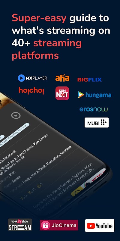 Información precisa sobre "dónde ver" miles de películas y programas en varios idiomas: inglés, hindi, tamil, telugu, malayalam, kannada, bengalí, marathi, español, francés, alemán, entre otros, y en más de 40 plataformas OTT