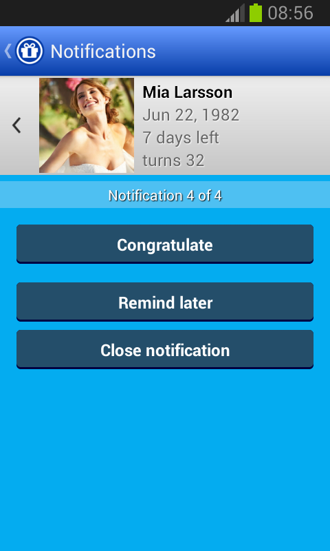 Choose to be reminded any number of days in advance, or on the birthday itself. You'll always know which day of the week your friends' anniversary, wedding day, birthday or countdown is — and how many days are left until that date.