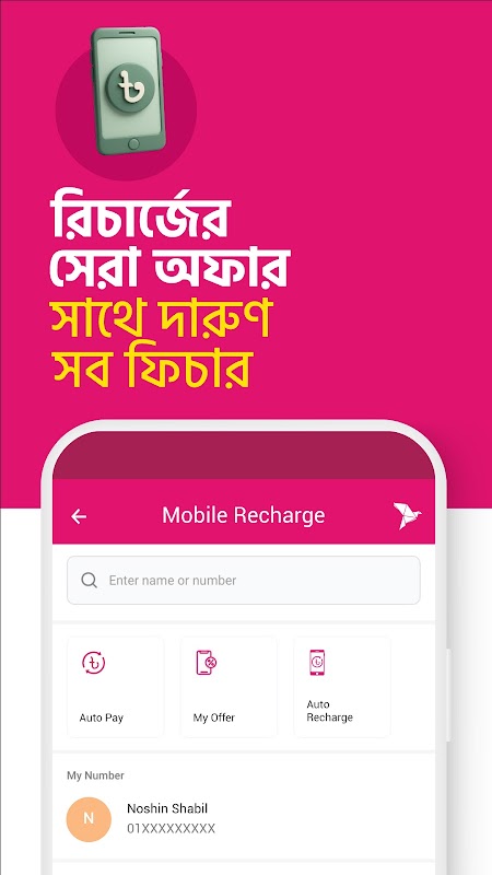 Deje que la aplicación bKash se encargue de las últimas ofertas y mejores ofertas de su operador de telefonía móvil. Vea y compre ofertas de Internet, Voz y Paquetes basados en recarga de diferentes operadores móviles en Recarga Móvil.