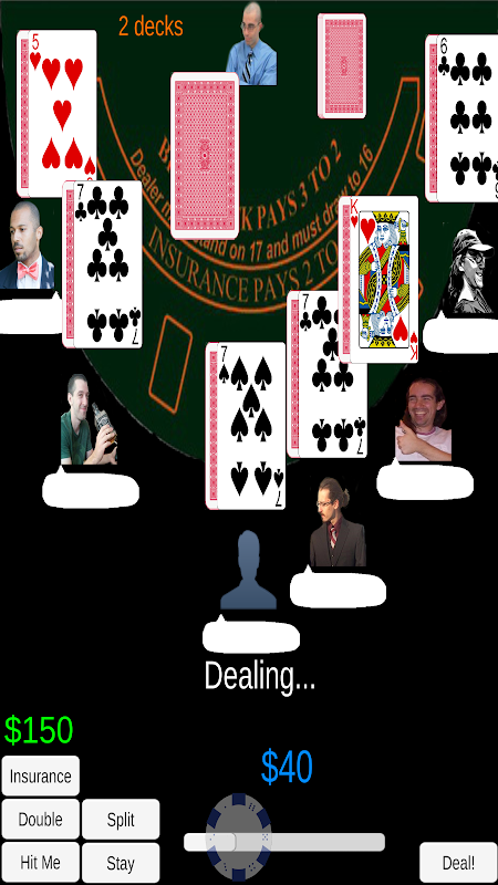 ¡Disfruta de una velada con tus amigos simulados Jesse, Jerry, Benjamin, Andre, Paul, Boris y el repartidor George! ¡Cada uno tiene su propia IA única, excepto el crupier que debe sacar 16 y plantarse en 17!