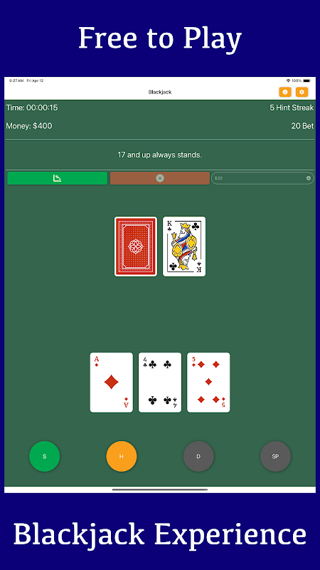 Blackjack Strategy Training es la mejor herramienta para dominar el arte del blackjack. Diseñada tanto para principiantes como para jugadores experimentados, esta completa aplicación está diseñada para mejorar tus habilidades y profundizar tu comprensión de las estrategias principales del Blackjack. Desde aprender los fundamentos hasta perfeccionar técnicas avanzadas, nuestra aplicación te proporciona el conocimiento esencial para jugar con confianza y mejorar tus posibilidades de éxito. Ya sea que se esté preparando para el casino o simplemente esté buscando mejorar su juego, Blackjack Strategy Training es su compañero confiable para el dominio estratégico.