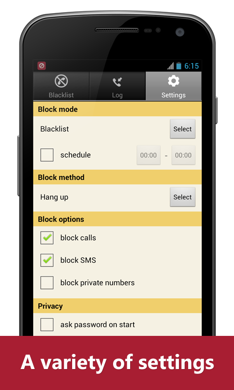 Blacklist Plus es un bloqueador de llamadas perfecto que se puede colgar al instante las llamadas no deseadas o simplemente apagar su sonido, dependiendo de qué método de bloque que ha seleccionado. No importa cuál sea su elección, el registro de llamadas de su teléfono se borrará de todos los rastros de las llamadas bloqueadas.