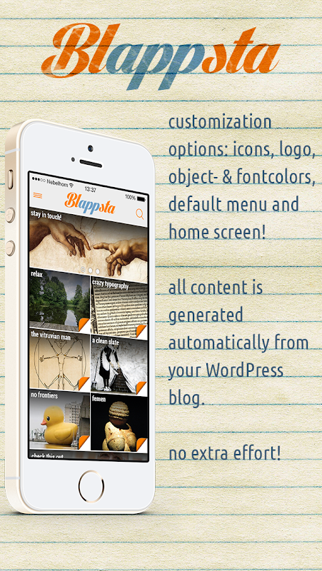 Welcome to Blappsta! Your Blog. Your App. Blappsta is a great way to communicate the contents of your WordPress blog completely for free and at lightning speed within your very own native iOS App. Reach out to your community whenever, wherever.