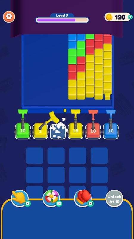 Dispara bloques de colores para despejar el atasco de bloques y haz una enorme explosión de bloques con el martillo.
