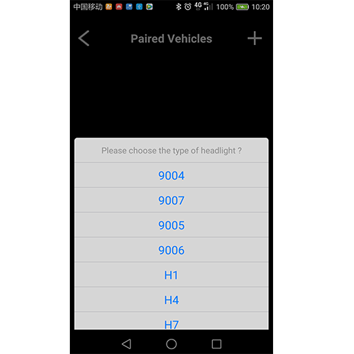 3). Pulse el botón superior izquierda “”, seleccione Configuración’-> Vehículos. Pulse el botón arriba a la derecha “+”. En “Añadir nuevo vehículo”, introduzca su nombre preferido para su vehículo, por ejemplo: número de matrícula, tipo de coche, etc. Pulse “OK” y el dispositivo le avisará que es “Análisis en busca de faros disponibles ...”. Introducir los códigos de ambos dispositivos SF300 se facilitan cuando se le solicite y pulse el botón ‘OK’. A continuación, elija el modelo de los faros cuando se le solicite durante el enlace “Seleccionar el tipo de lámpara”, el dispositivo se iniciará. Si tiene éxito, la notificación se abrirá, mostrando faros como “1” y “2”, los modelos de los faros, y la dirección de Bluetooth de cada faro. Si el acoplamiento ha fallado, emergente le notificará el acoplamiento ha fallado.