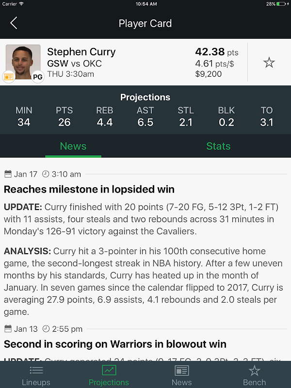 - Real-time alerts: Set your roster and leave it to us to update you on specific players’ news. If something happens to one of your selections, you’ll be alerted immediately and we’ll provide the strongest replacement. It’s like our version of a DFS waiver wire alert. You’ll never be caught unprepared. This alone could save your daily fantasy basketball season!
