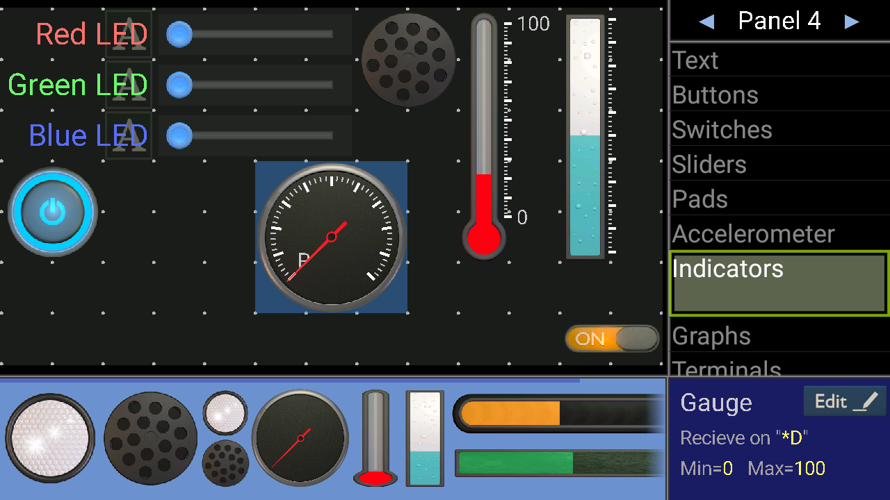 Amplia selección de controles disponibles, incluidos botones, interruptores, controles deslizantes, almohadillas, luces, medidores, terminales, acelerómetros y gráficos. Arrástrelos y suéltelos en la cuadrícula del panel. Luego edite sus propiedades.