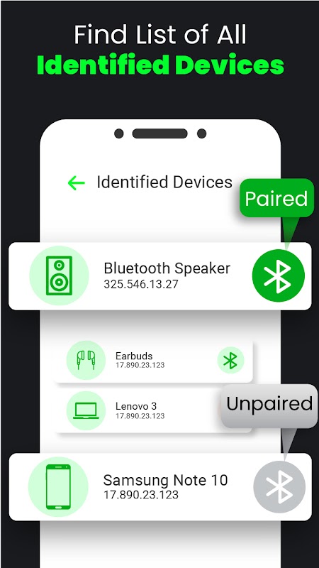 El app para encontrar mis airpods determina qué dispositivo Bluetooth está conectado a su dispositivo, ya que este buscador de dispositivos se pierde en el escáner bluetooth. Buscador bluetooth scanner lo ayuda a determinar si el emparejamiento bluetooth es un teléfono inteligente o una computadora portátil. De esta manera, el encontrar mi dispositivo bluetooth muestra el tipo de dispositivo. Si olvida el nombre de un dispositivo Bluetooth perdido, puede usar el buscador de dispositivos bluetooth para buscador bluetooth - escáner.