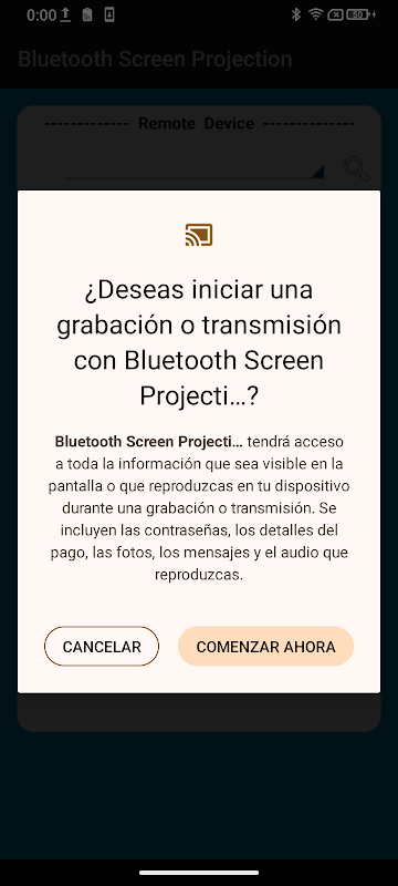 Aplicación demo para ver la pantalla de otro dispositivo remoto vía Bluetooth