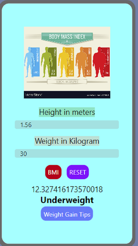 Cuando se abra la aplicación, habrá una calculadora de IMC. Escribe tu altura y peso usando medidas métricas. Si tiene bajo peso, puede hacer clic en "Consejos para ganar peso" y, si es gordo/obeso, encontrará "Consejos para perder peso". Si estás sano o en forma, no tienes ningún botón en el que hacer clic. Cuando haya terminado, puede volver a ingresar o salir de la aplicación.