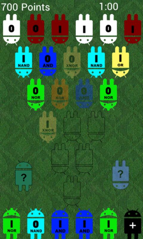 Boolitaire es un juego de cartas estratégico basado en la lógica booleana. Partiendo de una cadena de bits dada, debes establecer una pirámide de puertas lógicas. Esto se logra colocando puertas lógicas (representadas por cartas). Una puerta lógica realiza una operación booleana con dos entradas y devuelve un número binario (1 o 0).