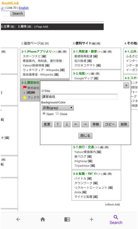 (Addボタン).....追加ボタン、現在表示しているURLをBooMLinkにワンクリックでブックマークとして追加します。(保存先:「追加ページ」列の「iPhoneアプリより」行にリンクが追加されていきます)検索ボタンで追加したいホームページを表示させ、この追加ボタンを押していくやり方がおすすめです。追加後のカテゴリ移動・並び替え・編集も楽なので、どんどん追加して仕分けしていきましょう!