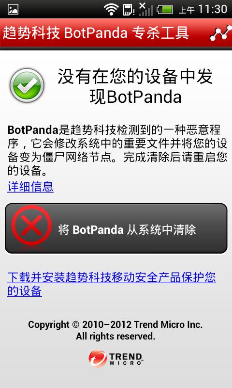 Trend Micro BotPanda Cleaner is a standalone android antivirus tool that scans Android devices to detect infections from the Android virus called BotPanda.A. BotPanda.A is an android virus that infects rooted android devices, it places malicious files onto the device that allow a hacker to take control of the device from anywhere on the internet.