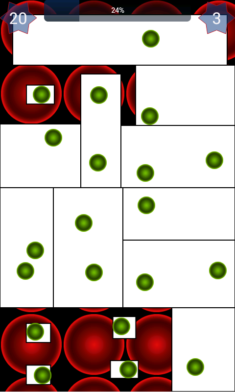 "Bouncing Balls" is a fun game developed for entertainment purpose only. Your goal is to partition the region into smaller regions by swiping either vertically or horizontally. If a region contains no balls, it gets freed. Your have to free up at-least 80% of the area to move on to the next level.