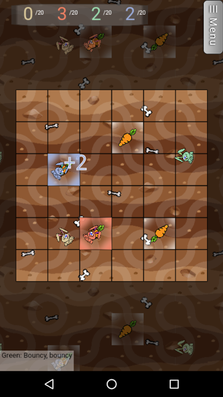 Los conejos serán bloqueados por otros conejos en la misma zona de la madriguera. Sin embargo, no son bloqueados por otros conejos en la misma casilla, sino en diferentes zonas de la madriguera. Los conejos que reboten se detendrán si alcanzan una zanahoria y ganarán puntos dependiendo de si la han alcanzado primero o último. A los demás conejos se les impedirá entrar en esa casilla, incluso si están en la otra zona de la madriguera.