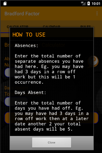Bradford Factor aplicación calcula su puntuación, ocurrencias y días, las reglas de la pista